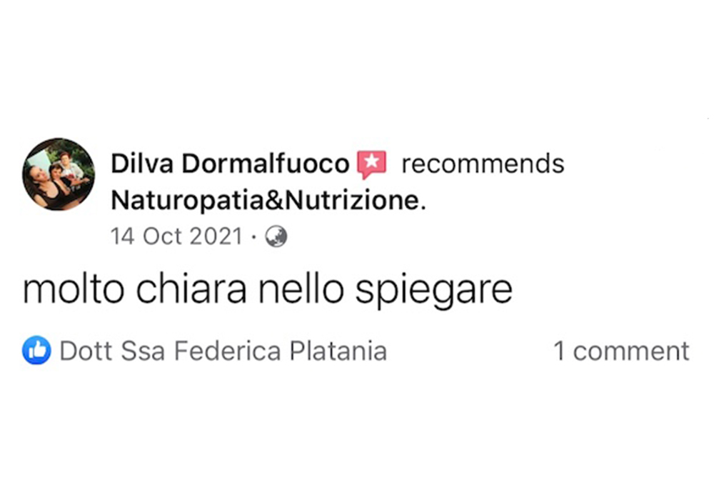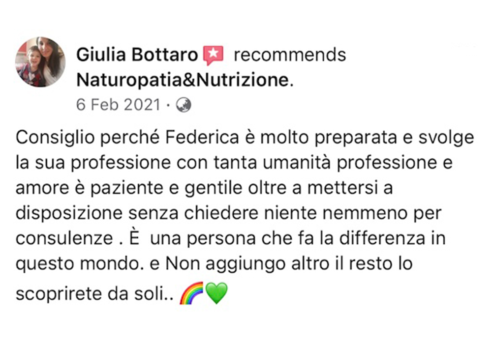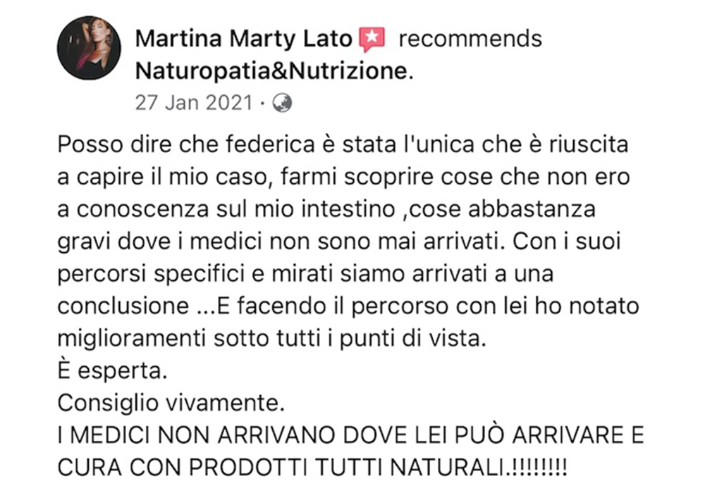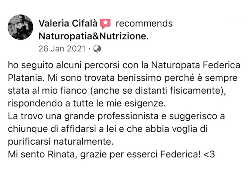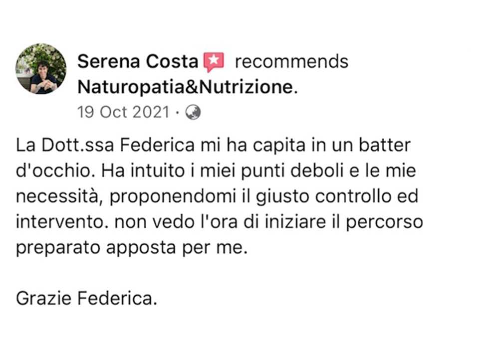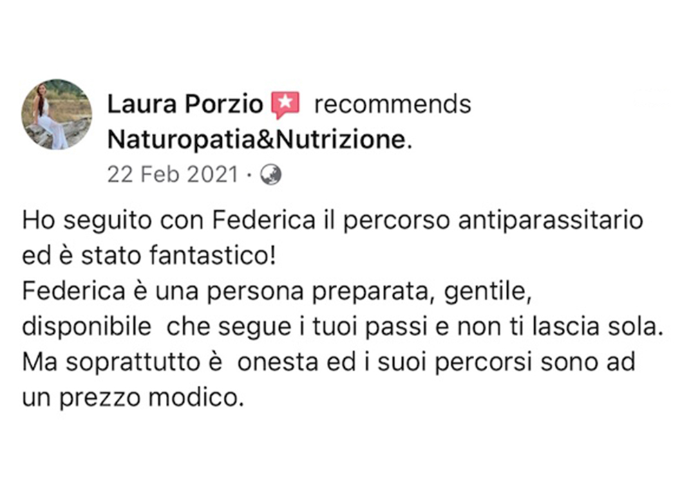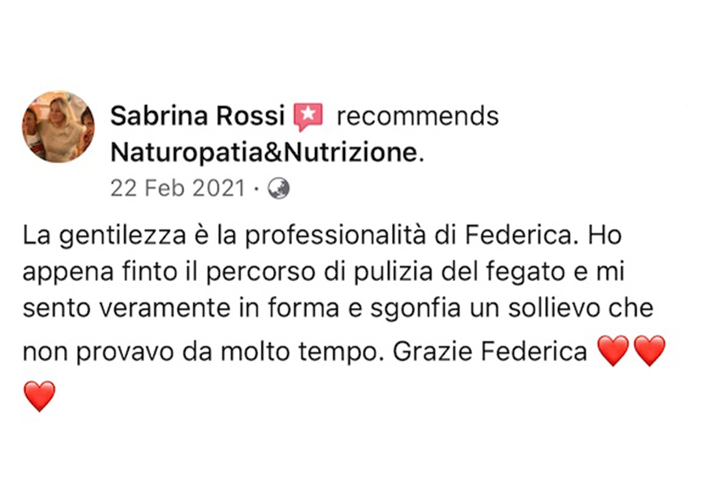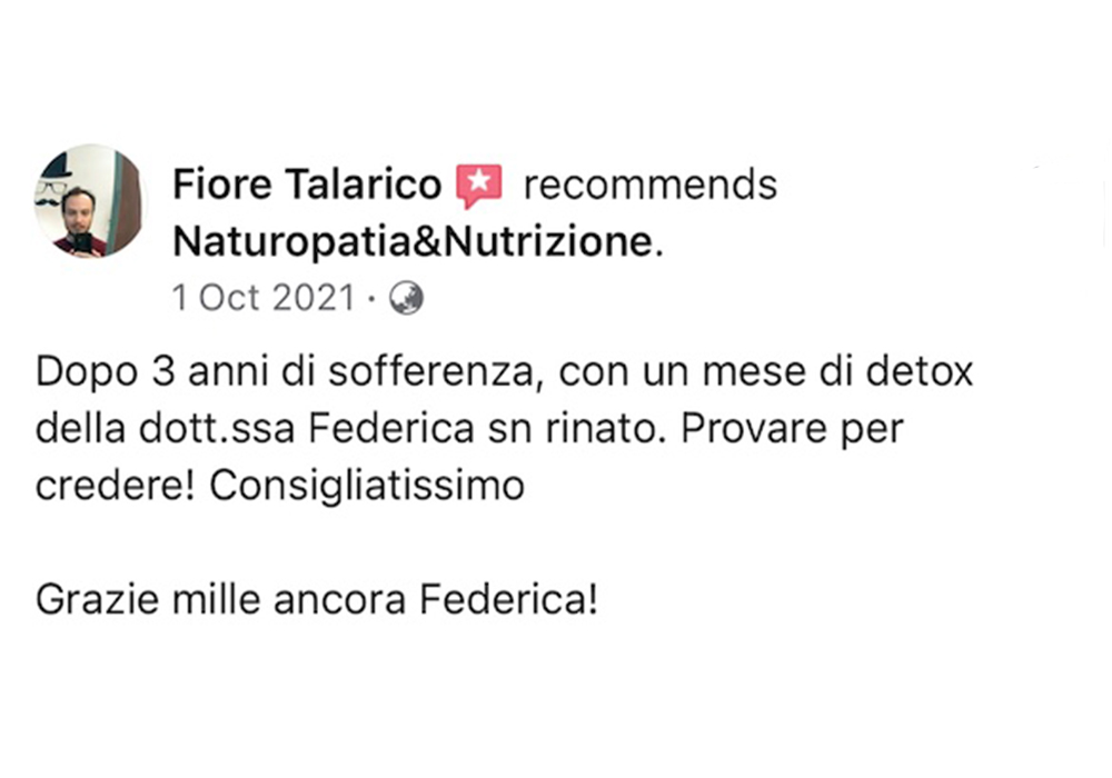 Federica grande donna è professionista fantastica❤️io e mio marito abbiamo fatto molti percorsi con lei e tutti sono finiti con sorprendenti risultati, l’ultimo di mio marito detox per i reni con valori oltre il limite è dopo un mese di verdura cruda, pesce azzurro e frutta rifatto gli esami e nessun asterisco. Premetto che il medico ci aveva prescritto medicine e detto che ci sarebbe voluto un anno per rientrare nei limiti. Grazie alla mia musa salvatrice ❤️❤️❤️fidatevi è veramente una professionista e a prezzi veramente onesti, buona vita