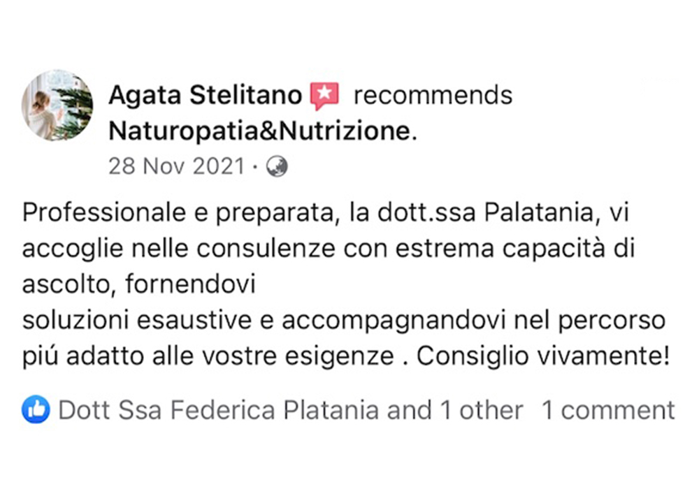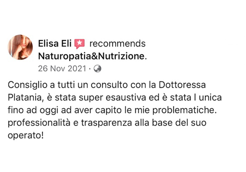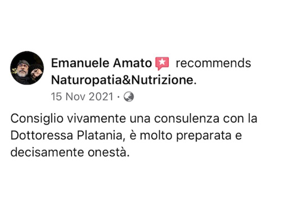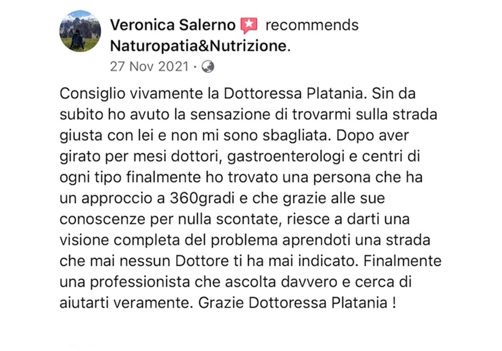 Ho conosciuto la dottoressa Platania sui social in un momento delicato, il mio medico di base mi aveva fatto venire un’ ulcera a causa di una terapia sbagliata per una patologia inesistente tra l’altro. I miracoli della medicina tradizionale….allora mi sono rivolto a lei che con grande passione ed empatia mi ha dato una dieta e piano piano ho rivoluzionato la mia alimentazione trovandomi a distanza di due anni una persona completamente diversa sana e sportiva eliminando quel grasso addominale che non voleva lasciarmi. La consiglio a tutti per l’amore che mette nel suo lavoro